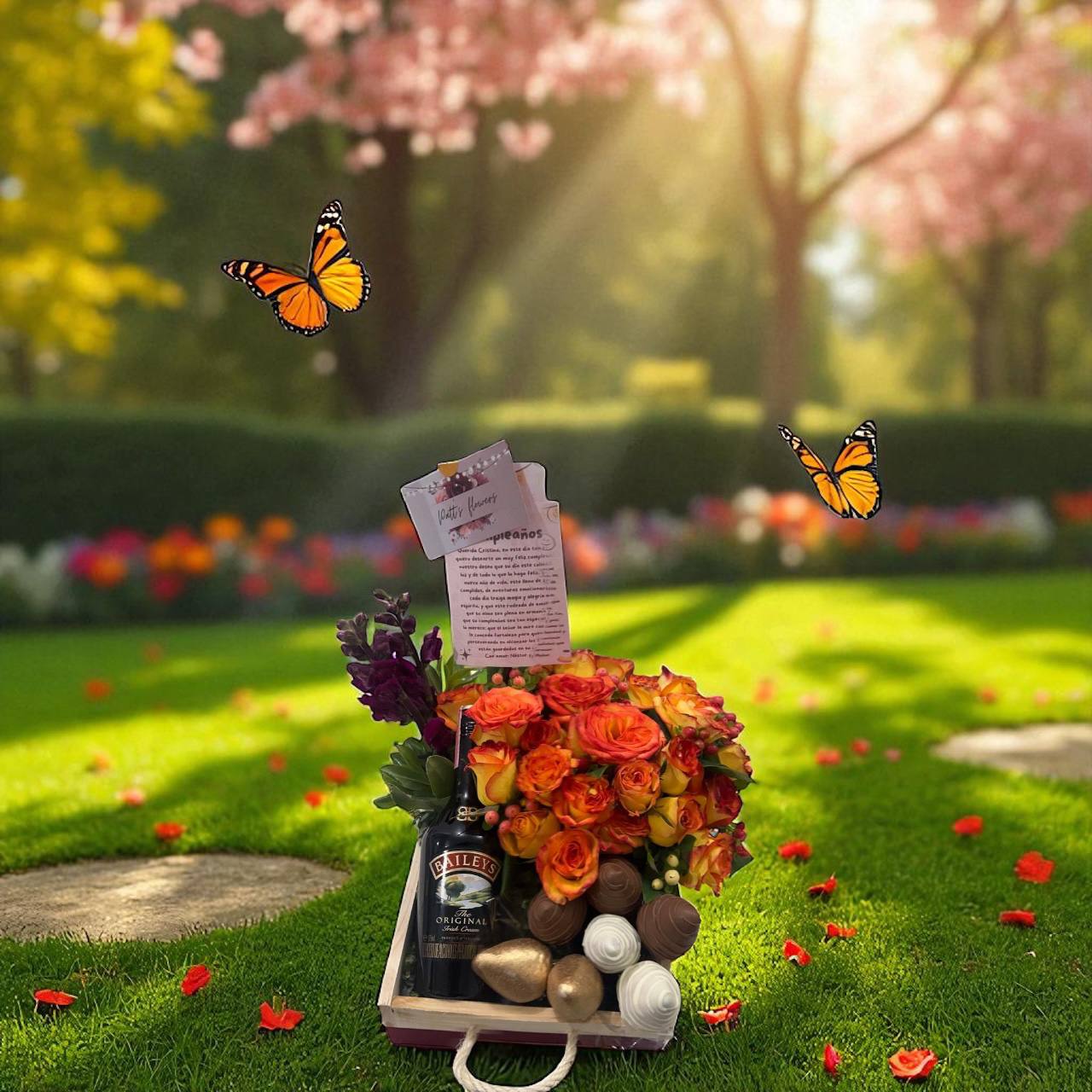 Caja de madera con rosas, fresas y botella mediana de baileys. Atardecer